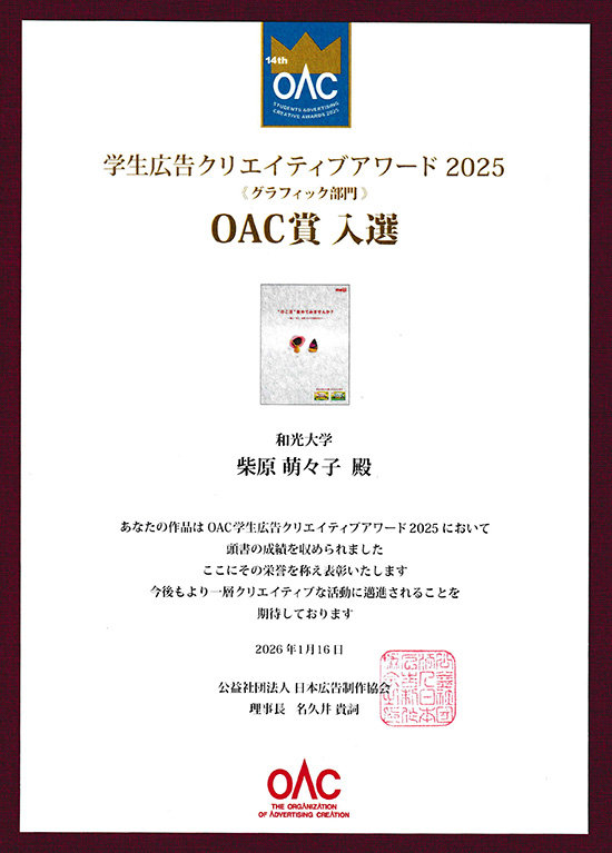 公益社団法人日本広告制作協会(OAC)が主催する「第14回OAC学生広告クリエイティブアワード2025」の授賞式が、2026年1月16日に行われました。そこで柴原萌々子さんの入選も発表されました。