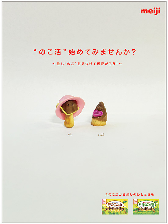 今回の柴原さんの作品は、「”のこ活”始めてみませんか?」というキャッチコピーで、昨今の「推し活」の社会現象を、お菓子の広告表現に活用したアイデアです。