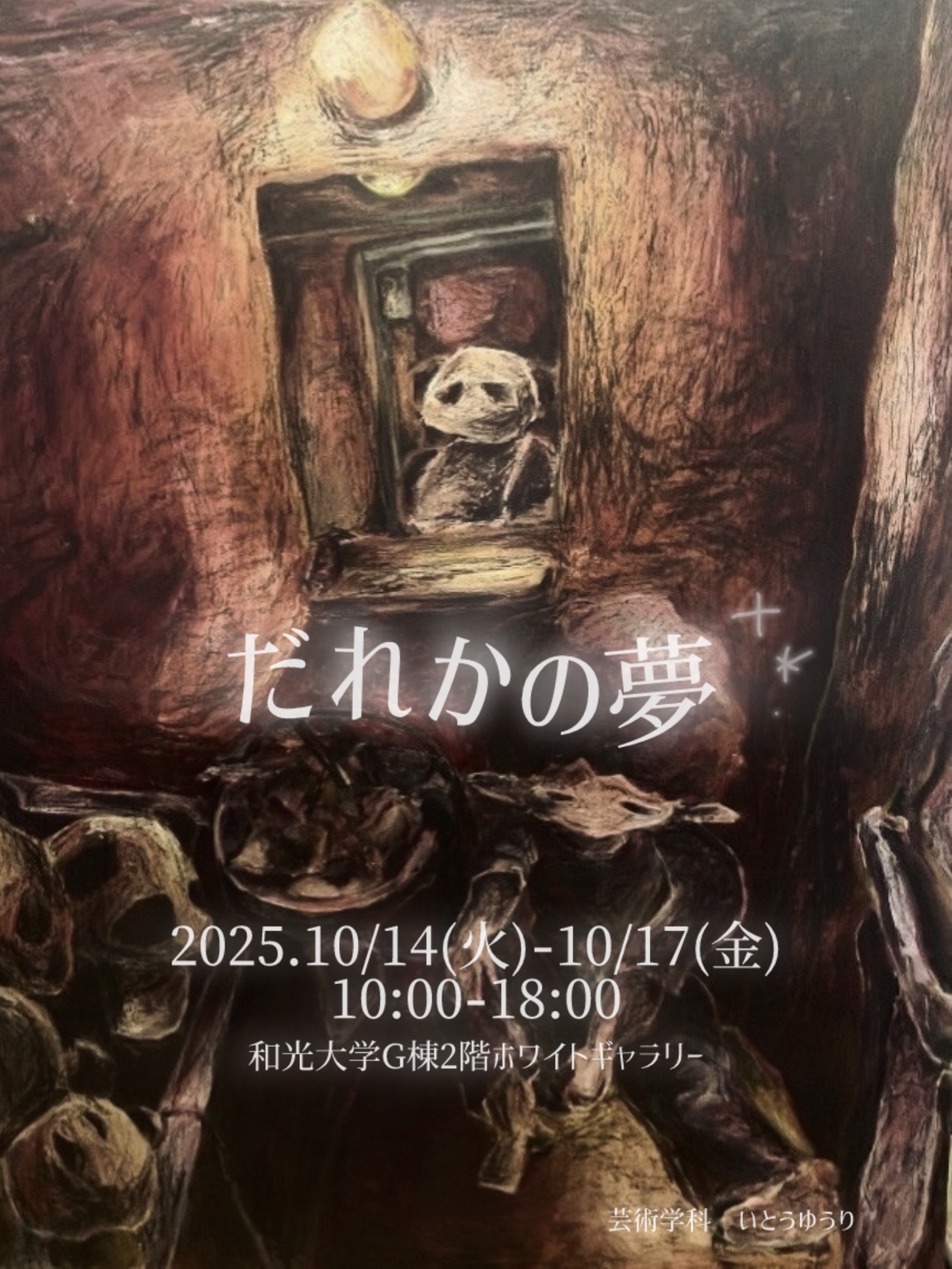 2025年10月11日 学生トピックス 10/14-10/17 いとうゆうり 個展 22Gのいとうゆうりさんが、ホワイトギャラリーで個展を開催されます。 ぜひお越しください。 いとうゆうり「だれかの夢」 会期:2025年10月14日(火)-10月17日(金) 時間:10:00-18:00 会場:和光大学G棟2F ホワイトギャラリー Prev 一覧に戻る Next カテゴリー 展示情報 イベント 授業風景 日常風景 その他 学生トピックス 未分類 学科トピックス 卒業生の活躍 学生作品ギャラリー TOPイメージ ゼミ風景