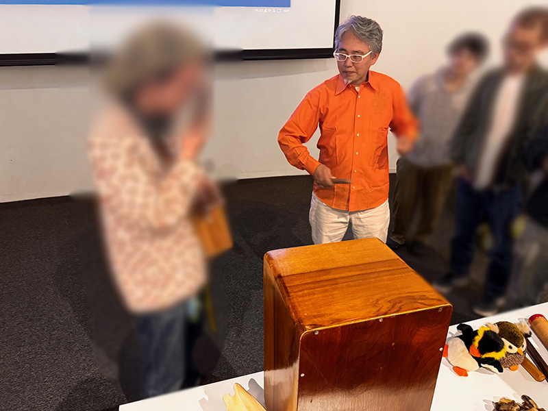 講義テーマはアンデス諸国の打楽器の構造、リズム、奏法、編成、文化背景についてのレクチャー。